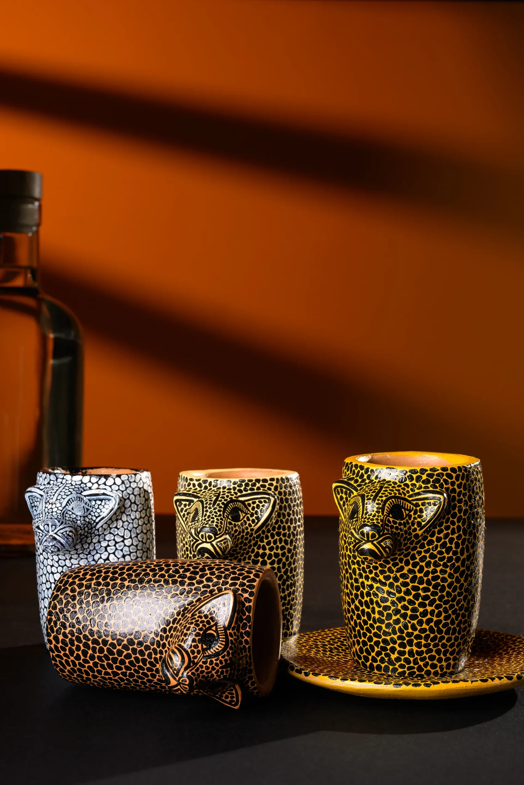 In Mayan tradition, the jaguar is an animal that represents protection and power. These pieces form a unique and elegant collection for special occasions, where tradition and design merge to complement a good drink.